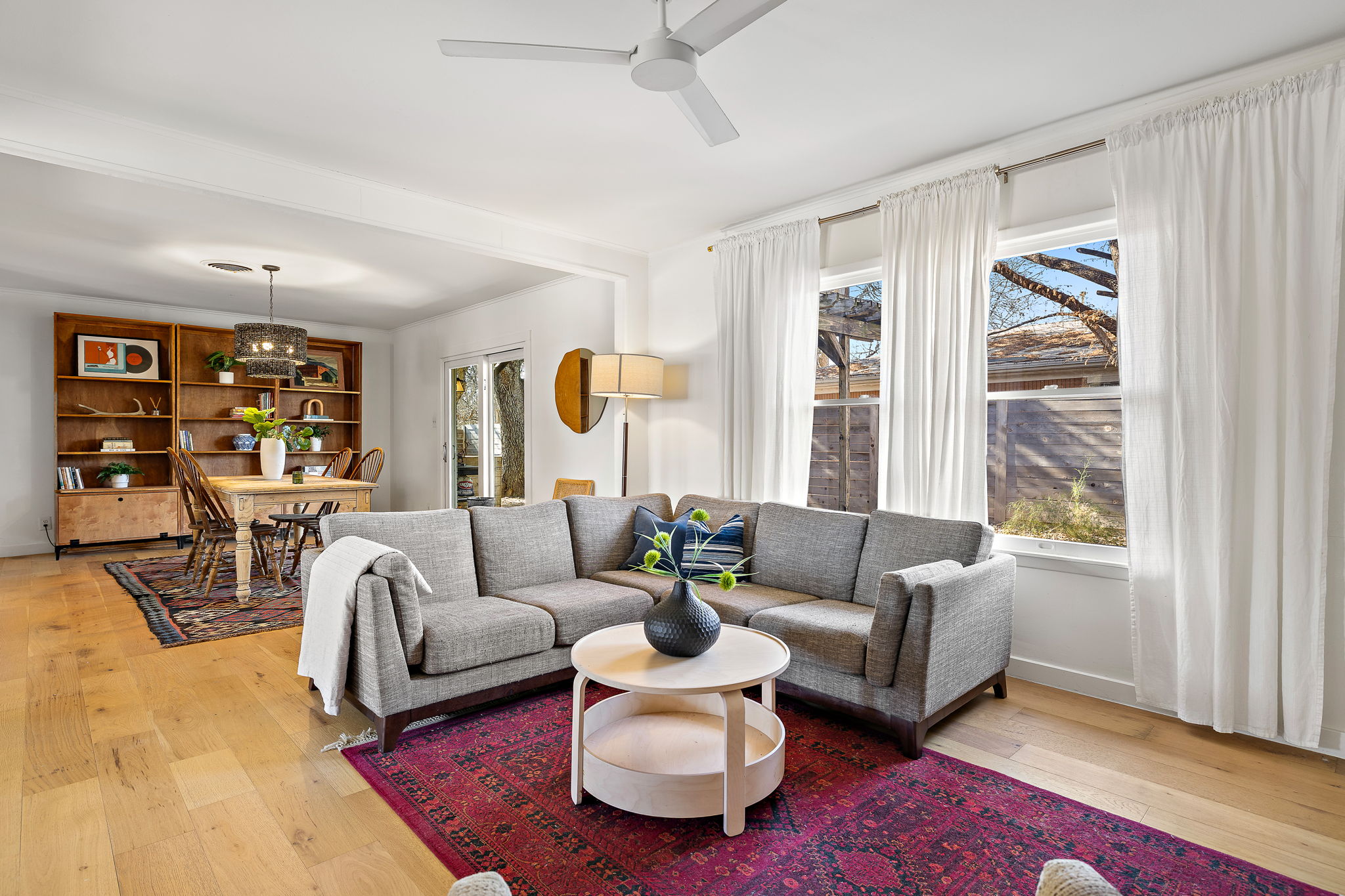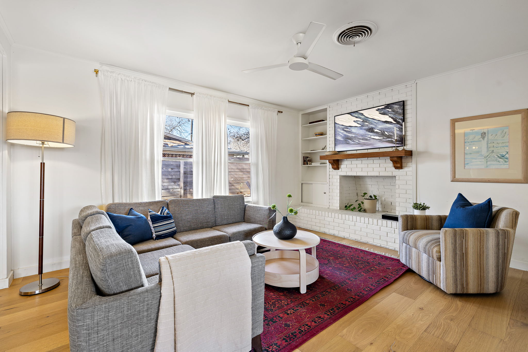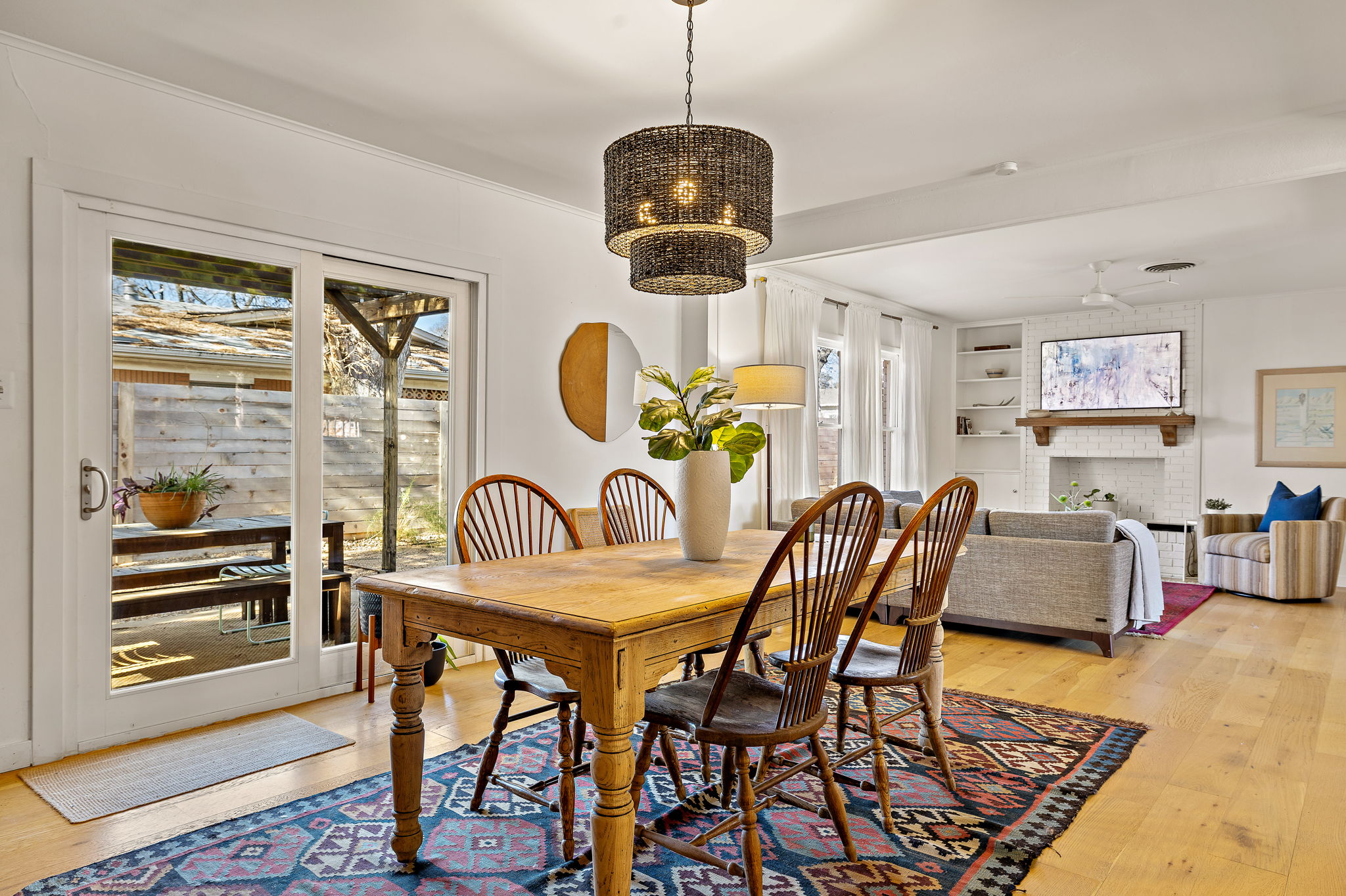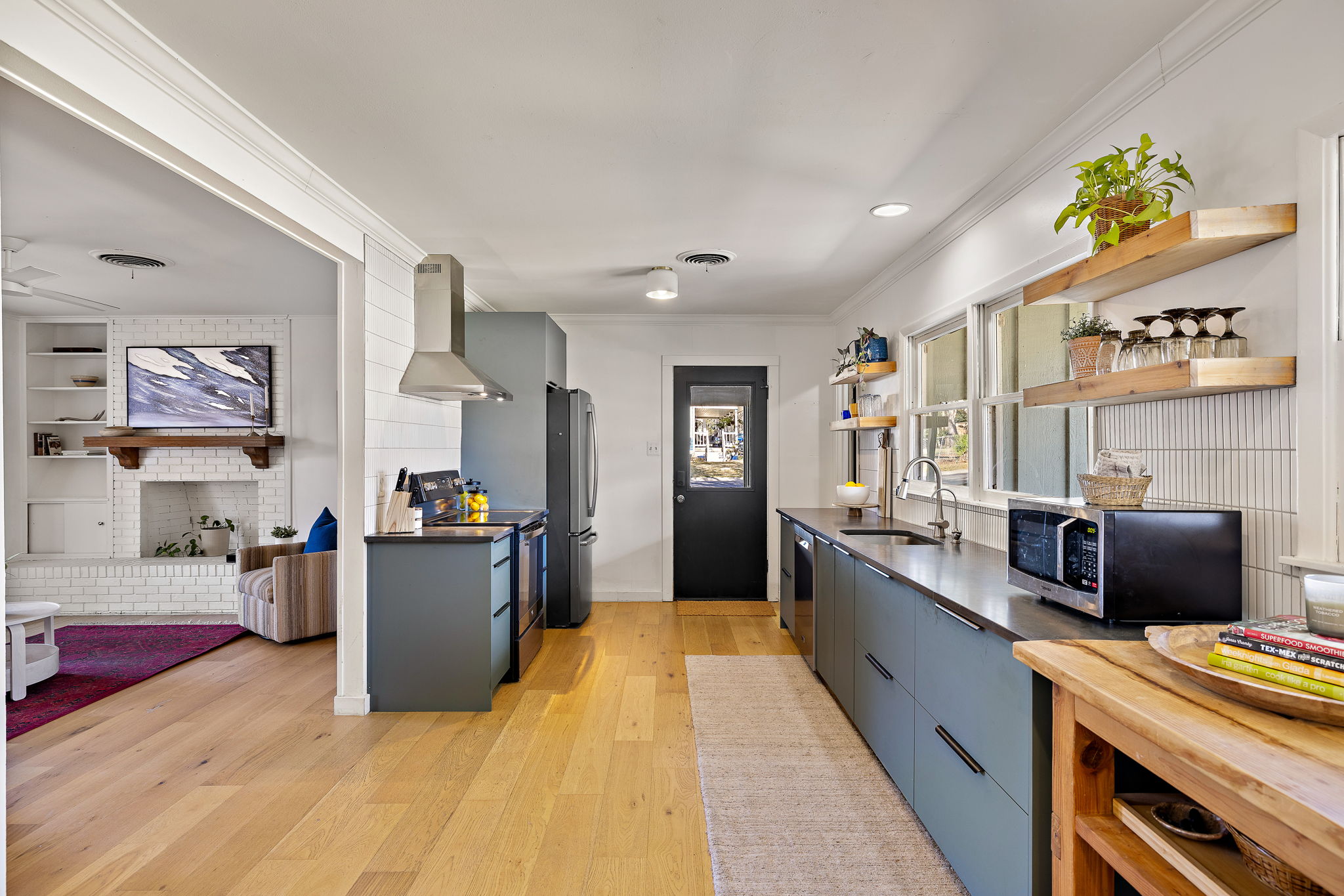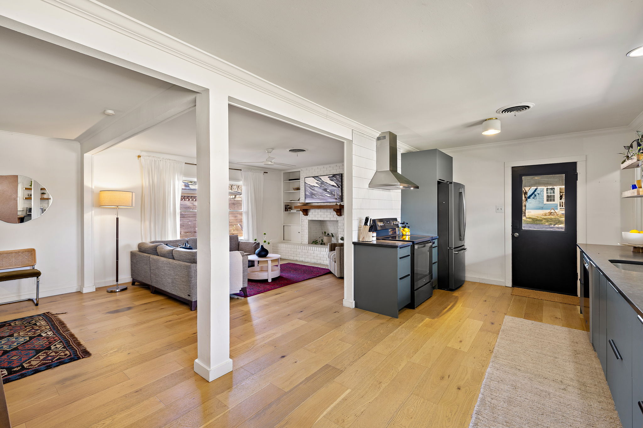 Inside, engineered white oak wood floors run throughout the home, creating a light, cohesive feel. The spacious living room is anchored by a wood-burning fireplace, flanked by built-in shelving and large windows that fill the space with natural light. The living, dining, and kitchen areas flow seamlessly together, offering an easy, open feel that works well for both daily life and entertaining.