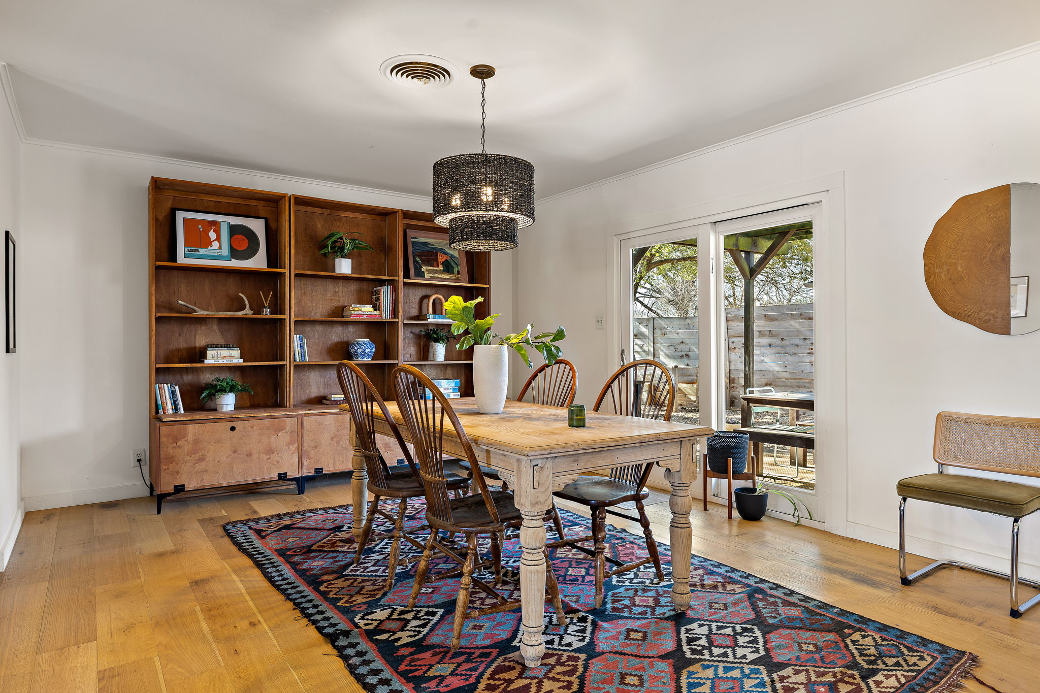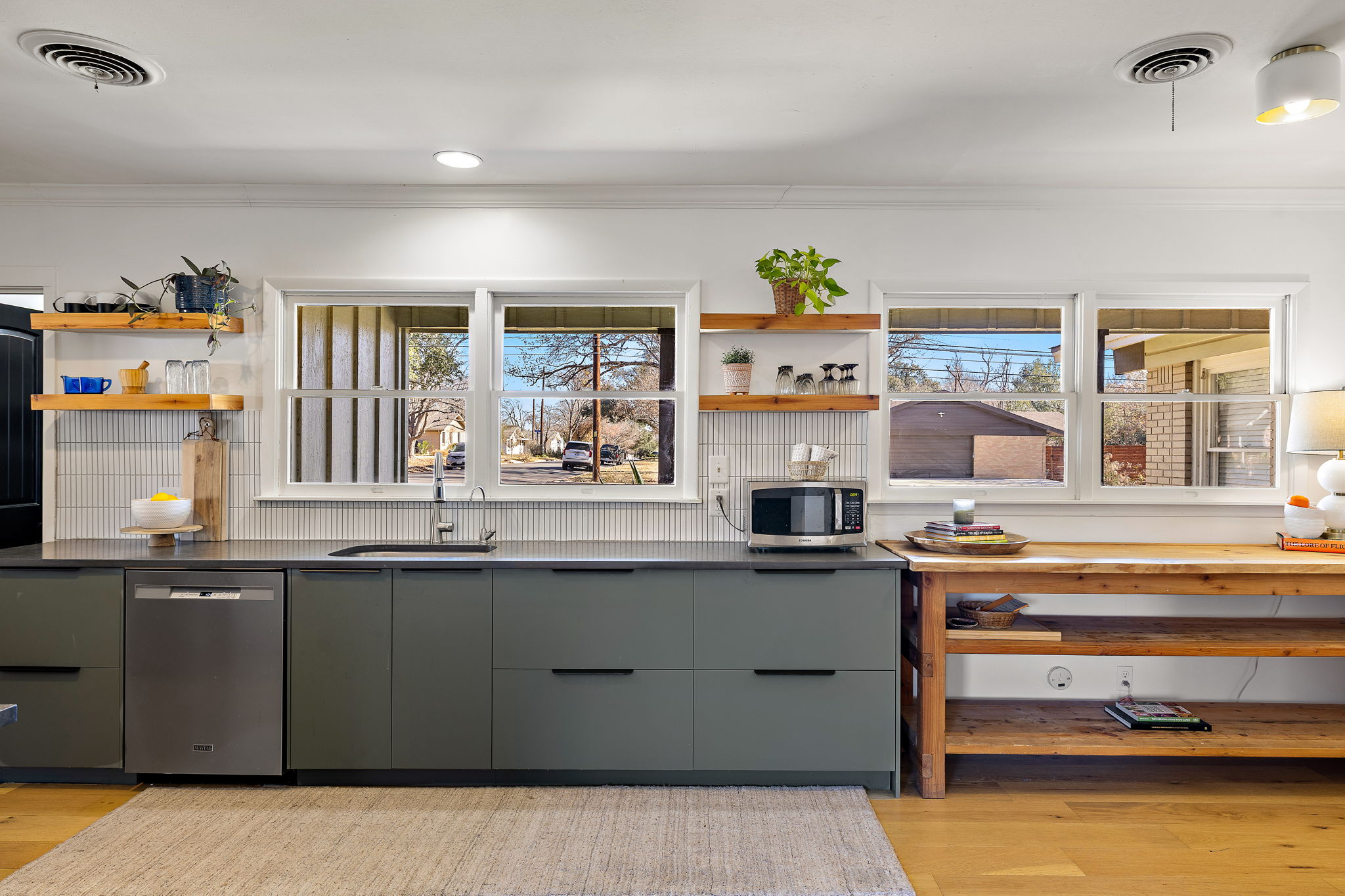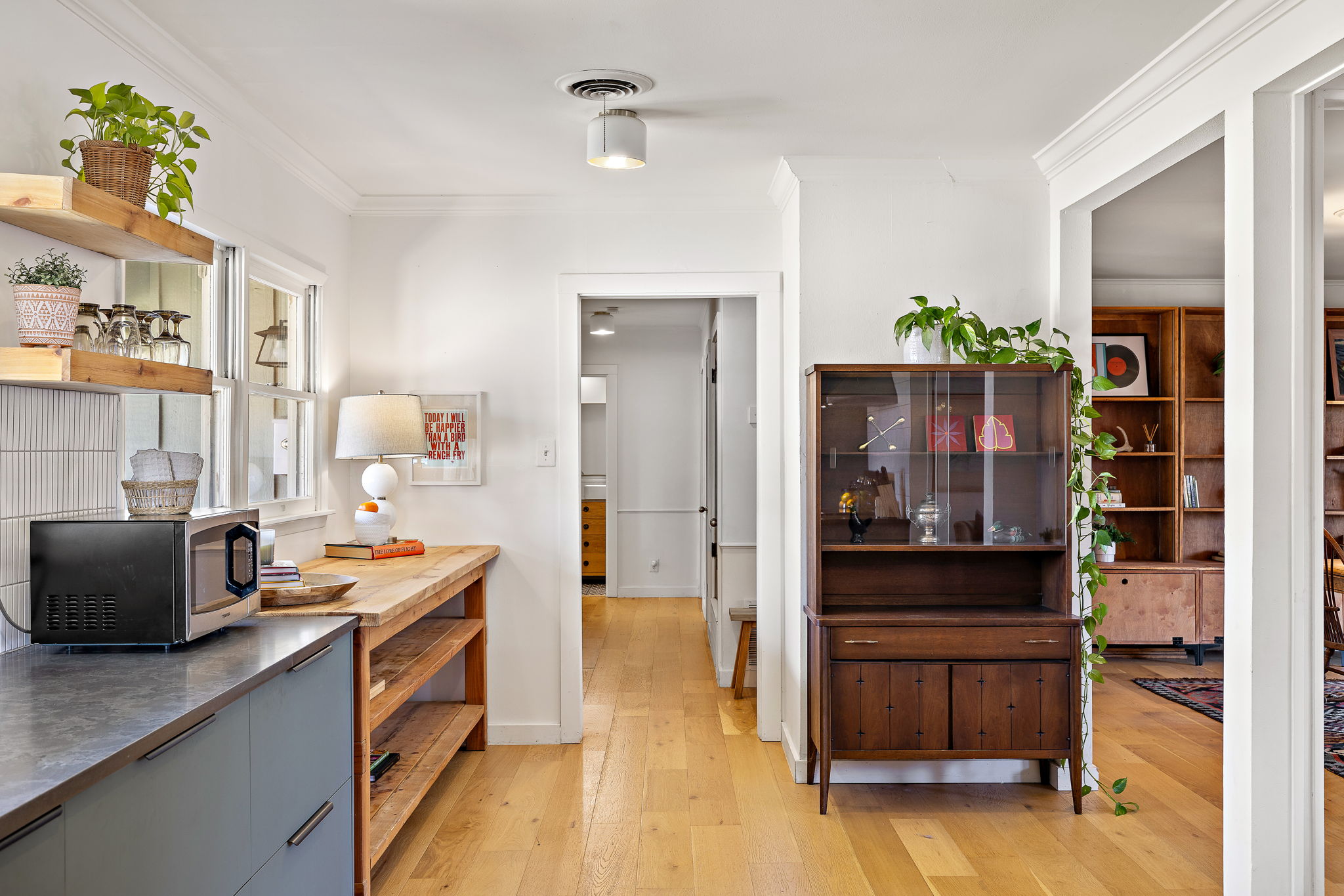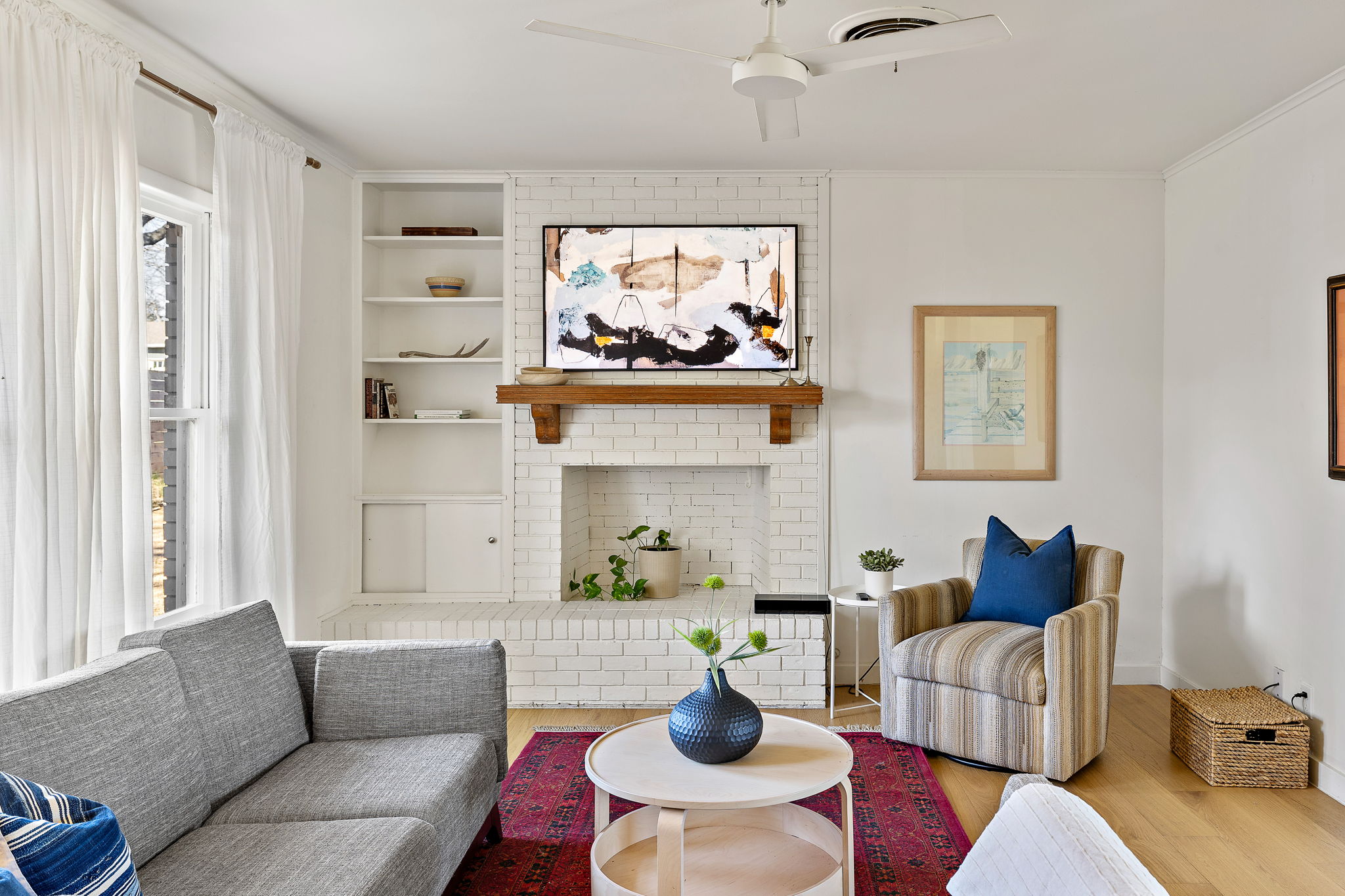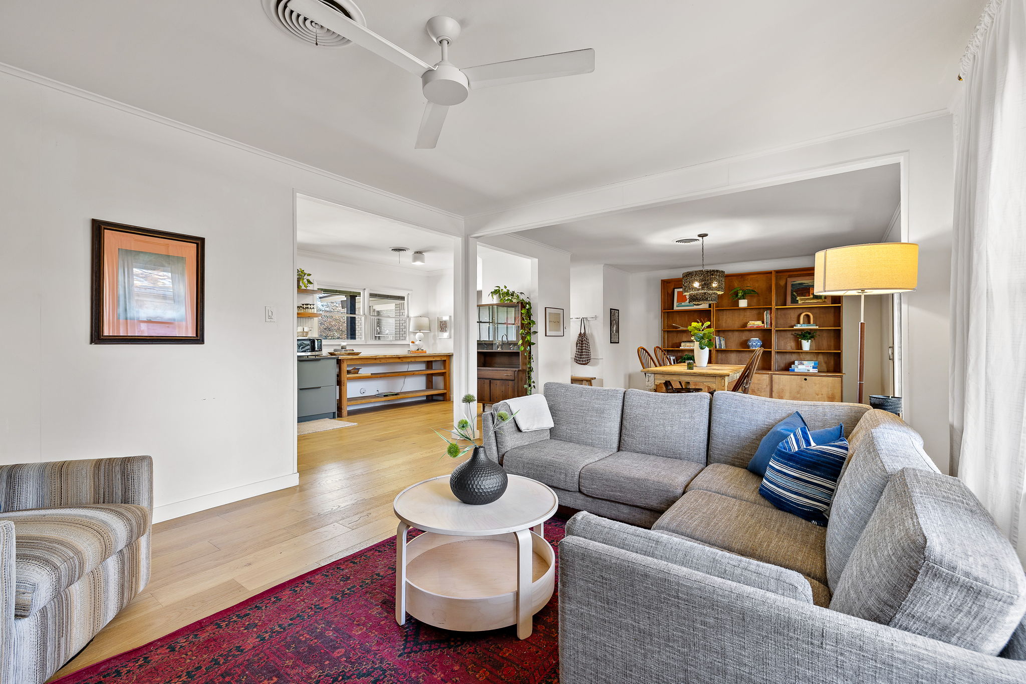 Inside, engineered white oak wood floors run throughout the home, creating a light, cohesive feel. The spacious living room is anchored by a wood-burning fireplace, flanked by built-in shelving and large windows that fill the space with natural light. The living, dining, and kitchen areas flow seamlessly together, offering an easy, open feel that works well for both daily life and entertaining.