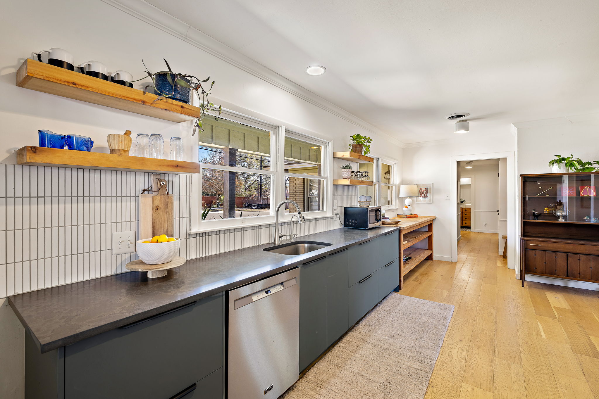 The kitchen was updated with new cabinetry, quartz countertops, a new sink, stove, and dishwasher, along with generous storage and a walk-in pantry. Sliding glass doors connect the interior to the backyard, enhancing indoor-outdoor flow and making the space ideal for relaxing or hosting guests.