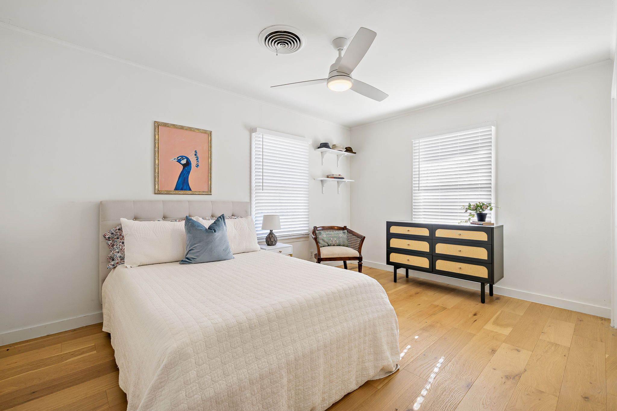 The primary suite offers a comfortable retreat with an ensuite bath featuring a double vanity and a walk-in shower with a glass enclosure. Two additional bedrooms share a well-appointed secondary bath, creating a flexible layout for guests, family, or home office needs. Remote-controlled ceiling fans and updated light fixtures throughout the home add comfort and convenience.